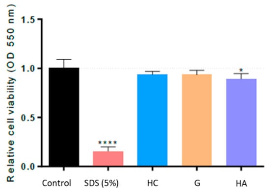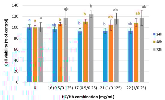 2.2. Viability of Fibroblast Cell Cultures Treated with HC and HA Combinations