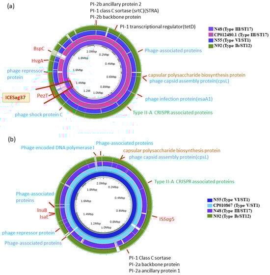 Whole-genome sequence analysis of one type III/ST17 GBS strain (N48), one Ib/ST12 GBS strain (N92), one VI/ST1 GBS strain (N55), and two reference strains, CP012480.1 (type III/ST17) and CP010867 (type V/ST1). The genome scales in mega base pairs of these two reference strains are given in the inner circle of (a,b), respectively. The N48 and N92 are from neonates with GBS meningitis, and N55 represents neonatal sepsis without meningitis. TBLASTN comparisons of the genomes of the reference GBS strains are shown in different colors and compared with the complete genomes of three clinical GBS isolates. Of note, the HspC, PezT, and ICESag37 genes are present in N48 and N92, but absent in N55. The HvgA gene is type III/ST-17 GBS-specific and noted in N48 only. Additionally, several genes encoding several phage-associated proteins, PI-1- and PI-2a-associated proteins, and type I CRISPR-associated proteins are present in type Ib/ST12 GBS strains only.