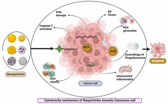 Related to the anticancer activity of NPs, Mujahid et al. [20] explained the mechanism according to Figure 2. Against cancerous cells, nanoparticles induce the Caspase 3 pathway. This leads to diverse cellular processes and mechanisms, such as reactive oxygen species (ROS) generation, ER (Endoplasmic reticulum) stress, autophagolysosomal accumulation, LDH (Lactate Dehydrogenase) release, and mitochondrial disruption. All these processes lead to the collapse of the cellular framework and, finally, cell death.