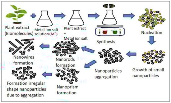 Various metabolites incorporated in plant extracts act as stabilizing and reducing agents during metallic NP synthesis. It is well known that bioreduction is a complex process. The biomolecules in the extract perform as a reducing agent by providing electrons to the metal ions, leading to their reduction to the elemental metal. The formed atoms operate as a nucleation center, followed by a growth period in which adjacent smaller particles combine to create larger NPs. In this regard, plant extracts have the ability to stabilize NPs in the final stage of synthesis, ultimately determining their energetically stable and favorable morphology. Further, to inhibit further growth and maintain the particle in the nanoscale range, a capping agent is added. Thus, biomolecules in the plant extract can serve as a reducing agent, or the same molecules can serve as both a reducing agent and a capping agent. Considering all these aspects, the principle of plant-based synthesis has been explained in Figure 3 [36,37].