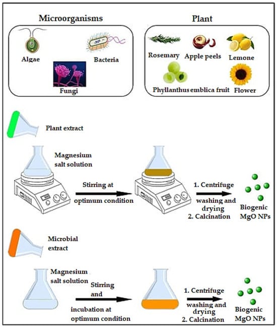- Kumar, P.P.; Bhatlu, M.L.D.; Sukanya, K.; Karthikeyan, S.; Jayan, N. Synthesis of magnesium oxide nanoparticle by eco friendly method (green synthesis)—A review. Mater. Today Proc. 2021, 37, 3028–3030. [Google Scholar] [CrossRef]