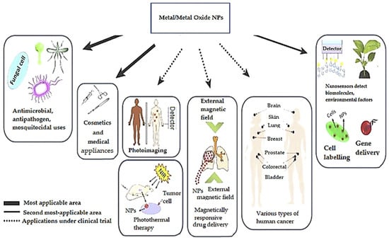 The most studied material groups are metallic and oxide nanoparticles (NPs). Numerous research studies have shown that metals (e.g., Cu, Ag, Pt, Au, Pt, Mg, Zn, etc.) and metal oxides (e.g., ZnO, TiO2, CuO, Ag2O, etc.) NPs have demonstrated significant therapeutic benefits. These benefits led to their application in various fields, such as drug delivery systems, biosensors, diagnostic imaging applications, and scaffolds for tissue engineering [3,4].