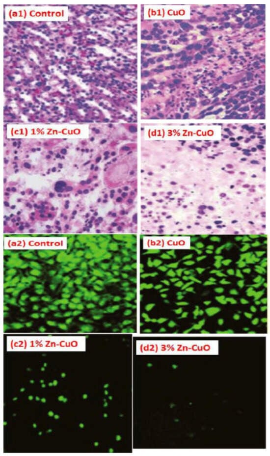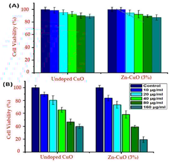 - Cao, Y.; Dhahad, H.A.; El-Shorbagy, M.A.; Alijani, H.Q.; Zakeri, M.; Heydari, A.; Bahonar, E.; Slouf, M.; Khatami, M.; Naderifar, M.; et al. Green synthesis of bimetallic ZnO-CuO nanoparticles and their cytotoxicity properties. Sci. Rep. 2021, 11, 23479. [Google Scholar] [CrossRef] [PubMed]