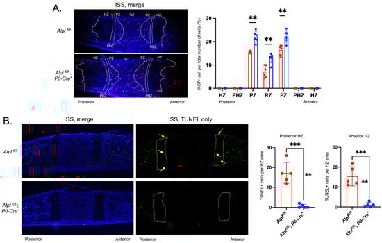 Next, we performed Ki67 staining to quantify proliferating cells in the synchondroses of 5-day-old mice. Ki67 positive staining was mainly present in the resting zone (RZ) and proliferation zone (PZ) of the mice, regardless of genotype (Figure 4A). When comparing genotypes, Ki67 positive staining was significantly greater in the RZ and PZ of Alplfl/fl; P0-Cre+ mice compared to Alplfl/fl ISS.