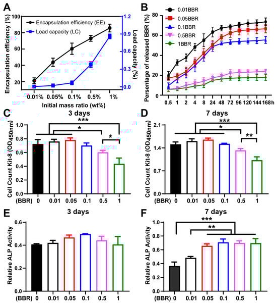 Detection of the encapsulation efficiency (EE), loading capacity (LC), and release profile of BBR, and its effects on MC3T3-E1 cells. (A) Detection of EE and LC for different concentrations of BBR-encapsulated microspheres. (B) Analysis of BBR release over time in encapsulated microspheres. The detection release lasted for 168 h and different concentrations of BBR-encapsulated microspheres were detected. (C,D) The proliferation of MC3T3-E1 cells cultured on different concentrations of BBR-encapsulated microspheres for 3 days (C) and 7 days (D) was detected by the CCK-8 method. (E,F) Detection of alkaline phosphatase activity of MC3T3-E1 cells on different microspheres at 3 days (E) and 7 days (F). The data show the mean ± SD, * p < 0.05, ** p < 0.01, *** p < 0.001; a one-way ANOVA with Tukey’s multiple comparisons test was used.