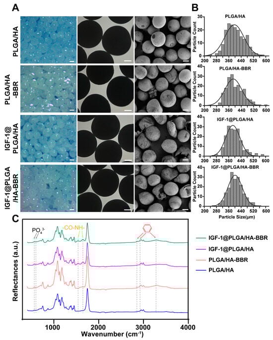 Characterization of PLGA/HA-based microspheres, BBR-encapsulated microspheres, IGF-1 modified microspheres, and composite hybrid microspheres. (A) The general morphology, micrographs, and ESEM photographs of microspheres in each group are shown. The scale bar in the second column of the figure is 100 μm, the scale bar in the first and third columns of figure is 200 μm. (B) Statistical analysis of particle size distribution of microspheres in each group. More than 180 microspheres, ranging in diameter from 240 to 600 μm, were measured in each group. (C) Analysis of the FT-IR spectra of microspheres in each group.
