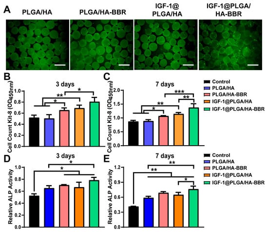 To evaluate the biocompatibility of composite microspheres, the adhesion and viability of MC3T3-E1 cells were detected. A FITC-staining assay was carried out and representative images are shown in Figure 3A. The number of cells marked green by FITC adhered to IGF-1@PLGA/HA-BBR microspheres was slightly higher than in the other groups. However, the cells on the microspheres in each group grew well. This result fully indicated that the amount of BBR released during the sustained drug release period (3 days) did not cause a significant negative effect on cell adhesion and growth. The results of cell viability (CCK-8) are shown in Figure 3B,C. The cells in all groups proliferated continuously with culture. At Days 3 and 7 of cell culture, the cell proliferation of MC3T3-E1 cells was significantly higher in all experimental groups compared to PLGA/HA and control groups (p < 0.05). In addition, cell viability at 7 days was significantly higher in IGF-1@PLGA/HA-BBR microspheres than in IGF-1@PLGA/HA and PLGA/HA-BBR microspheres (p < 0.05).