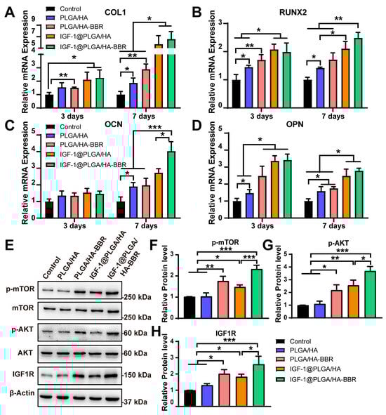 Figure 4A–D show the expression levels of mRNA associated with osteogenesis. Collagen I (COL1) is a major component of the bone extracellular matrix []. In the early stages of bone repair, osteoblasts colonize the defect and begin to secrete extracellular matrix, including COL1, to build the skeleton for osteoblast growth and mineralization. The large amount of early COL1 deposition will provide sufficient cell colonization and mineralization sites for bone repair. According to the results (Figure 4A), on Day 3, expression levels of COL1 in IGF-1-containing groups were significantly higher than those in the control group (p < 0.05). COL1 expression levels in PLGA/HA and PLGA/HA-BBR groups were higher than those in the control group, but only the difference between PLGA/HA-BBR and the control group was statistically significant. On Day 7, the expression levels of COL1 were extremely stimulated in IGF-1-containing groups compared to the other groups (p < 0.05). Meanwhile, the COL1 level in the PLGA/HA and PLGA/HA-BBR groups also significantly enhanced (p < 0.05). The expression of COL1 can be promoted by HA, BBR, and IGF-1 in MC3T3-E1 cells, with IGF-1 being the most effective factor.
