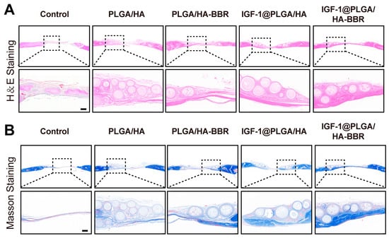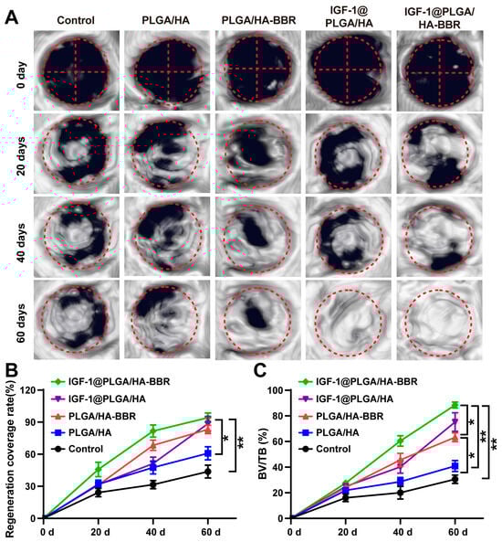 The IGF-1@PLGA/HA-BBR group showed a significantly higher bone volume over total volume (BV/TV) at the defect sites at each time point compared to the other groups (p < 0.05) (Figure 5C). The BV/TV in the PLGA/HA-BBR group and IGF-1@PLGA/HA group were consistently significantly higher than those in the control and PLGA/HA groups (p < 0.05). Similar to the regeneration coverage rate results, BV/TV in the PLGA/HA-BBR group was higher than that in the IGF-1@PLGA/HA group on Day 40, but lower than that in the IGF-1@PLGA/HA group on Day 60. These results indicated that the IGF-1@PLGA/HA-BBR could effectively promote the complete bony connection to cover the defect site.