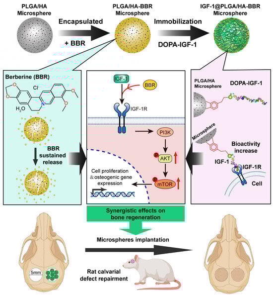 Schematic diagram of the composite bioactive microspheres for bone regeneration. BBR-encapsulated PLGA/HA microspheres were fabricated, immobilized by DOPA-IGF-1, and used for calvarial defect repair in rats. BBR and IGF-1 in microspheres have a synergistic effect in promoting osteogenesis.