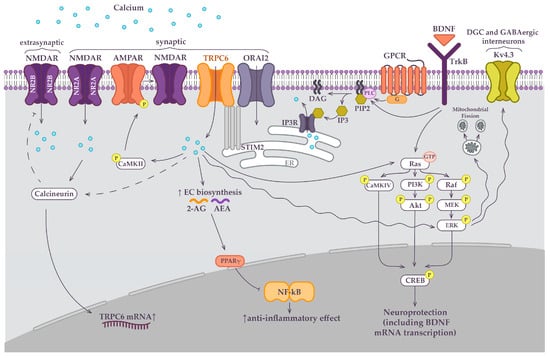 - Kim, J.E.; Park, J.Y.; Kang, T.C. TRPC6-Mediated ERK1/2 Activation Regulates Neuronal Excitability via Subcellular Kv4.3 Localization in the Rat Hippocampus. Front. Cell. Neurosci. 2017, 11, 316500. [Google Scholar] [CrossRef]