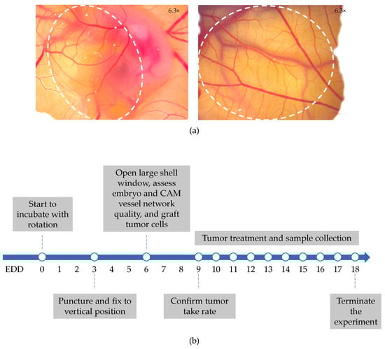 The CAM tumor model. (a) Microscopic images of the chick embryo and extra-embryonic vasculature on EDD 6 (left) and EDD 10 (right). The position of the CAM protruding from the embryo is encircled. Images were taken through the shell window at 6.3× magnification. (b) Typical time schedule for a CAM tumor experiment.