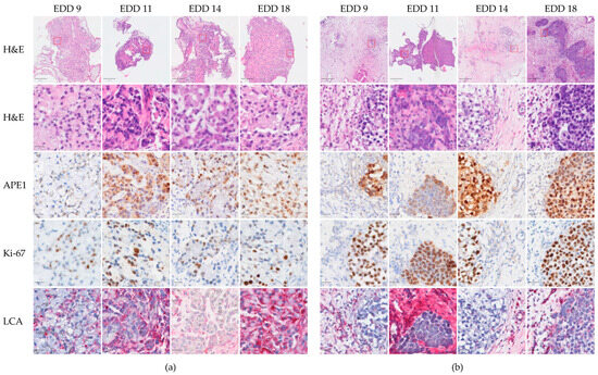 (Immuno)histological analysis of A549 (a) and H460 (b) NSCLC-CAM tumors. NSCLC cells were inoculated on the CAM in Matrigel on EDD 6 and allowed to form tumors. Established tumors on EDD 9 were followed until EDD 18. Representative examples of tumors dissected at the indicated EDD are shown. For their analysis, 4 μm sections from the same paraffin-embedded tumor were stained with hematoxylin-eosin or immunostained for APE1, Ki-67, or LCA as indicated. Positive APE1 or Ki-67 staining is indicated in brown, LCA in red, and hematoxylin counterstain in blue. Scale bars in the top rows are 250 μm; in all other rows, scale bars are 20 μm. The regions selected for magnification are depicted in the top row images.