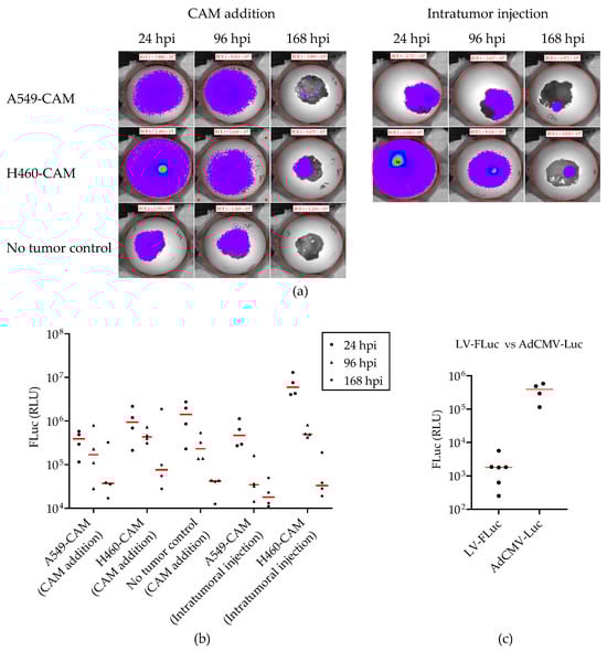 Because LV-mediated gene delivery was not very efficient, we investigated the feasibility of using an adenovirus vector (AdV) for the delivery of the firefly luciferase gene in the NSCLC-CAM tumor model. In a pilot experiment, we applied AdCMV-Luc in a single dose of 5 × 107 IU to fertilized chicken eggs at EDD 10. The eggs either carried established A549-CAM or H460-CAM tumors or were free of tumors. AdCMV-Luc was administered either via application onto the CAM or intratumoral injection. Bioluminescence was measured on EDD 11, 14, and 17, i.e., 24, 96, and 168 h post-infection (hpi) (Figure 6). Reproducibly, transient luciferase expression was detected, regardless of the route of administration. Luminescence was generally higher in eggs bearing H460 tumors than in eggs with A549 tumors (Figure 6b). Interestingly, luciferase expression was also detected upon the delivery of AdCMV-Luc onto the CAM of eggs without tumor. Thus, the systemic delivery of AdCMV-Luc transduced human NSCLC tumors and chicken tissue. Although AdV- and LV-mediated gene delivery efficiencies cannot be compared directly, average luminescence intensities measured upon a single AdCMV-Luc administration were more than 100-fold higher than could be reached with multiple LV-FLuc additions (Figure 6c).