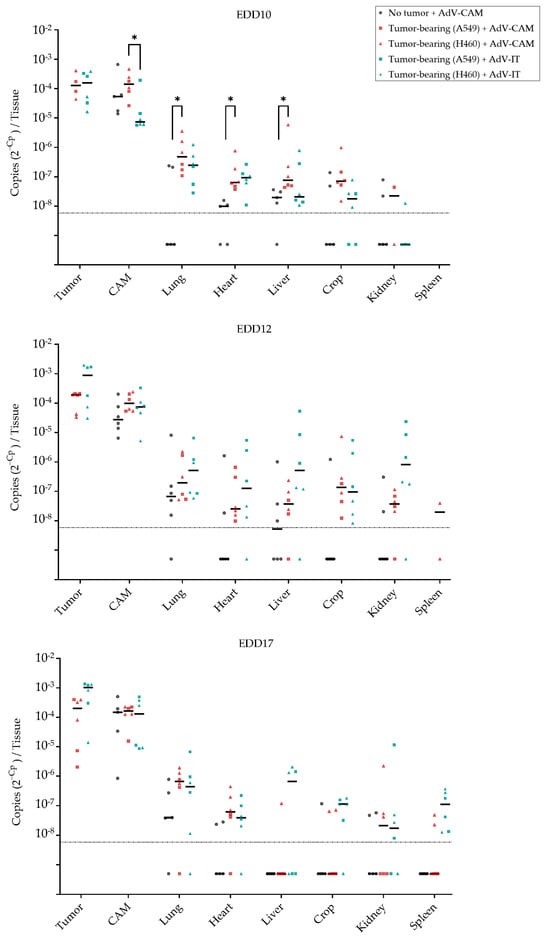 Biodistribution of AdCMV-Luc administered at 3 different time points to chicken embryos. AdCMV-Luc was administered to fertilized eggs with or without A549 or H460-CAM tumors either via application onto the CAM (AdV-CAM) or intratumoral injection (AdV-IT) on EDD 10, EDD 12, or EDD 17, as indicated. One day later, after measuring luciferase expression (see Figure 7), different tissues (tumor, CAM, lung, heart, liver, crop, kidney, spleen) were dissected and analyzed via qPCR. N = 3 eggs per treatment group (one tumor sample lost in the EDD10 H460-CAM and A459-CAM groups); with 5–6 negative control eggs on every analysis day. Spleens could not be dissected at EDD 10 and from only few embryos on EDD 12. AdCMV-Luc copy numbers are presented as 2–Cp values. For each treatment group, individual data points and medians (lines) are shown. The dashed line indicates the limit of detection. Negative qPCR results are depicted at an arbitrary position below this line. *, p < 0.05 (Kruskal–Wallis test).