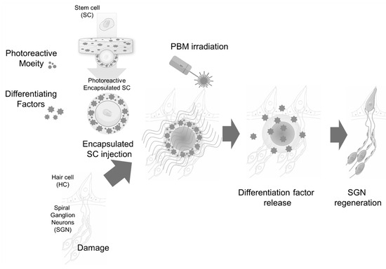 The main cause of hearing loss is damage to cochlear tissue in the inner ear. Normally, hair cells in the cochlea convert external mechanical signals into electrical signals and transmit them to the brain. Hair cell damage disrupts this process, causing hearing loss. Because hair cell damage or loss is irreversible, it is very difficult to treat hearing loss. Therefore, the rescue of hair cells is an important target for therapeutic treatment. Sensorineural hearing loss treatment using stem cells is currently being investigated, with a focus on restoring damaged hair cells. However, due to the structural complexity of the inner ear and the characteristics of the environment within the cochlea, the engraftment and survival rates of stem cells transplanted from outside the body have been insufficient to restore hearing loss. To overcome these limitations, some studies have attempted a PBM-based promotion of cell differentiation for cochlear hair cell regeneration. In an auditory study, otic cell differentiation was enhanced through otic vesicle formation and an increased proliferation of myosin VIIa-positive cells after three-dimensional mESC cultures were irradiated with 630 nm LED light to induce PBM. [80]. Non-invasive irradiation (>800 nm) of the inner ear through the tympanic membrane strengthened otic-like organoids and enhanced the adhesion and differentiation potential of transplanted stem cells within the cochlea [81]. The development of hearing rehabilitation technologies, such as cochlear implants, has allowed patients with profound hearing loss to regain their hearing [82]. However, spiral ganglion neurons, which are auditory neurons that transfer neural signals from the cochlea to the brainstem, must be healthy and functional to attain optimal cochlear implant performance [83]. Considering that these auditory neurons degenerate following hearing deprivation, the performance of cochlear implants tends to decline over time. Thus, the discovery of a technique for regenerating spiral ganglion neurons from stem cells would be highly beneficial to those with hearing loss. Although several studies have proposed methods for the differentiation of auditory neurons from stem cells [84,85,86], optimal methods have not been demonstrated for such auditory neuron differentiation within the cochlea or for stem cell migration to Rosenthal’s canal, where auditory neurons reside. PBM may not be best tool for inducing stem cell differentiation in Rosenthal’s canal because it is located in the medial section of the cochlea. Considering the low penetration rate in this anatomical region, PBM efficiency would be extremely low. However, there are alternatives, such as soluble hydrogel recently developed for delivering light energy to remote anatomical locations [87]. This hydrogel can be modified to encapsulate cell differentiation and homing factors for the neural differentiation of stem cells. Such an approach could allow us to selectively activate stem cells using light energy. A schematic of this methodology is shown in Figure 2.