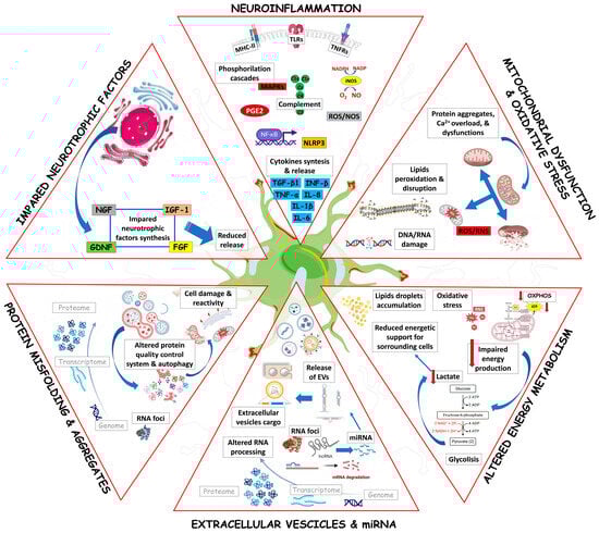 Figure 1 schematically summarizes the main pathogenic mechanisms that affect ALS astrocytes, concurring with their aberrant activation and neurotoxicity.