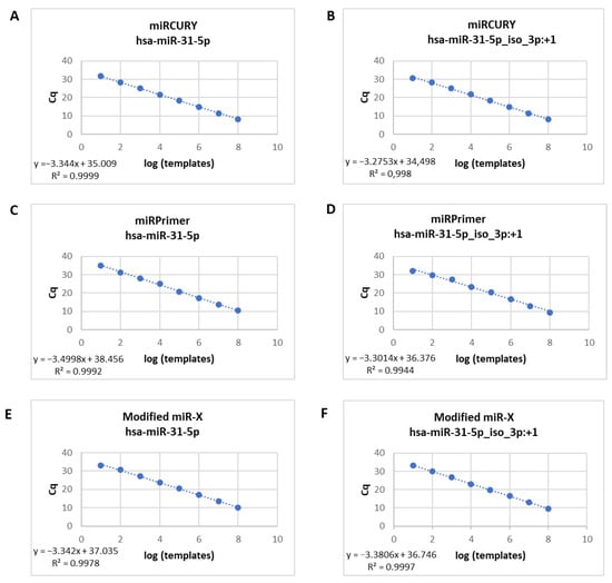 Standard curves for hsa-miR-31-5p and hsa-miR-31-5p iso_3p:+1 synthetic RNA assayed by RT-qPCR—the commercial miRCURY (A,B), miRPrimer2 (C,D) and modified miR-X (E,F) RT-qPCR strategies—in order to determine the sensitivity of these three RT-qPCR methods. Cq values extrapolated with serial dilutions of cDNA obtained from synthetic RNA exhibited outstanding linearity (R2: 0.99).