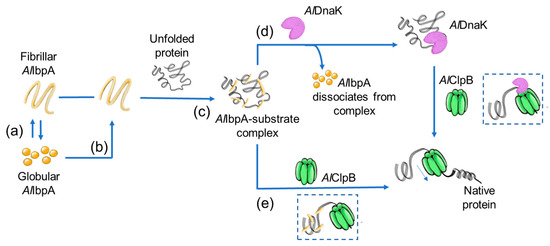 - Goloubinoff, P.; Mogk, A.; Zvi, A.P.; Tomoyasu, T.; Bukau, B. Sequential mechanism of solubilization and refolding of stable protein aggregates by a bichaperone network. Proc. Natl. Acad. Sci. USA 1999, 96, 13732–13737. [Google Scholar] [CrossRef]