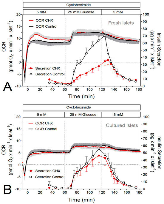 Simultaneous measurement of glucose-induced insulin secretion and oxygen consumption rate (OCR) by perifused islets in the presence and absence of the inhibitor of translation, cycloheximide (CHX). (A) Freshly isolated islets were perifused with Krebs–Ringer medium in the presence (red) or absence (black) of 10 μM CHX for 180 min. After 60 min the glucose concentration was raised from 5 to 25 mM and after a further 60 min it was lowered back to 5 mM. (B) Twenty-two-hour-cultured islets were perifused with Krebs–Ringer medium in the presence (red) or absence (black) of 10 μM CHX for 180 min. After 60 min the glucose concentration was raised from 5 to 25 mM and after a further 60 min it was lowered back to 5 mM. The traces indicate the oxygen measurements, and the circles indicate the measurement of insulin in the fractionated efflux. Values are means ± SEM of 6 experiments each.