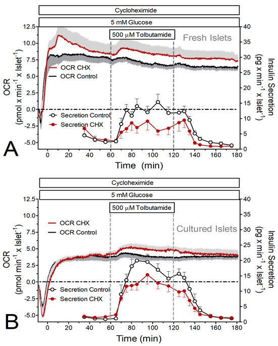 Simultaneous measurement of tolbutamide-induced insulin secretion and oxygen consumption rate (OCR) by perifused islets in the presence and absence of the inhibitor of translation, cycloheximide (CHX). (A) Freshly isolated islets were perifused with Krebs–Ringer medium in the presence (red) or absence (black) of 10 μM CHX for 180 min. After 60 min 500 μM tolbutamide was added to the perifusion medium containing 5 mM glucose. After a further 60 min, tolbutamide was washed out. (B) Twenty-two-hour-cultured islets were perifused with Krebs–Ringer medium in the presence (red) or absence (black) of 10 μM CHX for 180 min. After 60 min, 500 μM tolbutamide was added to the perifusion medium containing 5 mM glucose. After a further 60 min, tolbutamide was washed out. The traces indicate the oxygen measurements, and the circles indicate the measurement of insulin in the fractionated efflux. Values are means ± SEM of 5 experiments each.