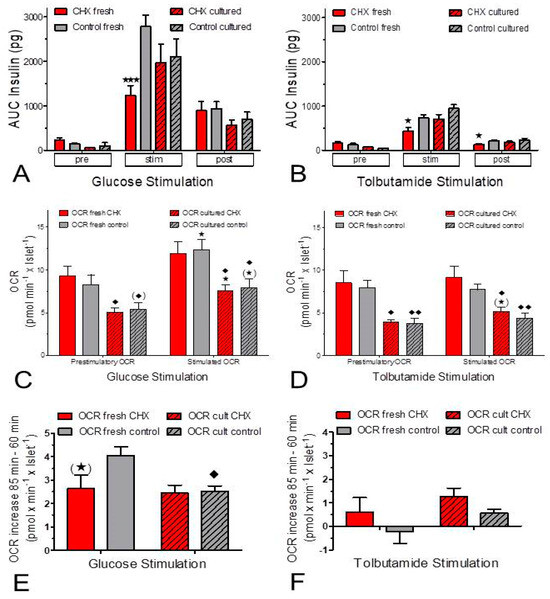 Side-by-side comparison of the insulin secretion (A,B) and oxygen consumption rate (OCR, C–F) as derived from Figure 1 and Figure 2. Fresh islets are indicated by open bars and cultured islets by hatched bars; the presence of cycloheximide (CHX) is indicated by red bars, and the control condition is indicated by grey bars. In (A,B) the asterisks denote significant differences between CHX and control (* p ˂ 0.05, *** p ˂ 0.001, t-test). In (C,D) the asterisks denote significant differences between the stimulated and prestimulatory OCR (* p ˂ 0.05, t-test) and the rhombus symbols denote significant differences between fresh islets and cultured islets (♦ p ˂ 0.05, t-test, ♦♦ p ˂ 0.01, t-test). In (E,F) the OCR increases induced by glucose and by tolbutamide are plotted. The asterisk in parentheses indicates a marginal significant difference (0.05 ≤ p ≤ 0.07, paired t-test) between CHX and control, the rhombus symbol denotes a significant difference between fresh islets and cultured islets (♦ p ˂ 0.05, paired t-test).