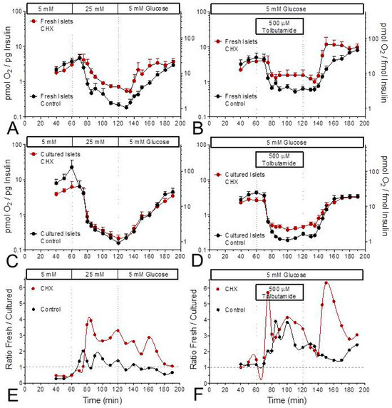 The ratio of OCR per secreted insulin was lower during stimulated secretion than during basal secretion; this was true for both stimulation by glucose and stimulation by tolbutamide (Figure 4). While the OCR-secretion ratio decreased throughout the entire phase of glucose stimulation, a plateau was reached early during tolbutamide depolarization (Figure 4A–D). During stimulation, the oxygen consumption per released insulin was higher in CHX-exposed fresh islets than in control fresh islets (Figure 4A,B). This difference was also visible during tolbutamide stimulation of cultured islets, but not during glucose stimulation of cultured islets (Figure 4C,D). Or, from a different perspective, CHX increased the difference between fresh and cultured islets, and more clearly so for glucose stimulation than for tolbutamide stimulation (Figure 4E,F).