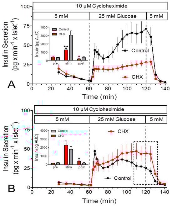 Measurement of insulin secretion in the presence and absence of cycloheximide (CHX) by islets exposed to a square-wave glucose stimulus. Freshly isolated (A) or cultured islets (B) were perifused at 0.9 mL/min with Krebs–Ringer medium in the presence (red) or absence (black) of 10 μM cycloheximide (CHX) for 140 min. After 60 min the glucose concentration was raised from 5 to 25 mM, and after a further 60 min it was lowered back to 5 mM. Note the clear biphasic pattern both in fresh and in cultured control islets. Asterisks denote significant differences between CHX and control (* p ˂ 0.05, ** p ˂ 0.01, t-test). The dashed rectangle in (B) denotes the values where the secretion was significantly higher in the presence of CHX. Values are means ± SEM of 6 experiments each.
