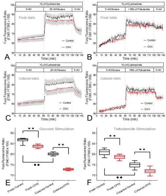 The cytosolic Ca2+ concentration ([Ca2+]i) during stimulation of fresh or cultured islets by glucose (A,B) or tolbutamide (C,D). Freshly isolated islets (A,C) and cultured islets (B,D) were loaded with Fura-2/AM and perifused with Krebs–Ringer medium in the presence (red traces) or absence (black traces) of 10 μM cycloheximide (CHX). After 60 min of perifusion with 5 mM glucose, the glucose concentration was raised to 25 mM or 500 μM tolbutamide was added. After a further 60 min the stimuli were washed out. For all conditions the mean values of the steady state during stimulation (70 min to 80 min) were calculated and compared (E,F). The boxes show the median, the whiskers show the 1–99 percentile of 8–12 experiments each. Asterisks denote significant differences between CHX and control (** p ˂ 0.01, ANOVA with Tukey’s post test), rhombus symbols denote significant differences between fresh islets and cultured islets (♦♦ p ˂ 0.01, ANOVA with Tukey’s post test).
