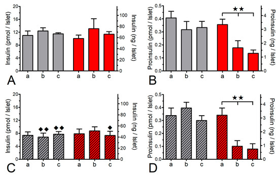 Effect of cycloheximide (CHX) on the islet contents of insulin (A,C) and proinsulin (B,D). Freshly isolated islets (open bars) or cultured islets (hatched bars) were statically incubated in the presence of 5 mM glucose for 0 min (a) or 60 min (b) and for a further 60 min in the presence of 25 mM glucose (c) in the presence (red bars) or absence (grey bars) of 10 μM CHX. After 60 min exposure to CHX the content of proinsulin, but not of insulin, was significantly reduced in fresh and in cultured islets. Note the higher content of insulin, but not proinsulin, in fresh islets. ** p ˂ 0.01, ANOVA with Bonferroni’s post test. ♦ p ˂ 0.05, ♦♦ p ˂ 0.01, t-test fresh v. cultured islets. Values are means ± SEM of 6 experiments.