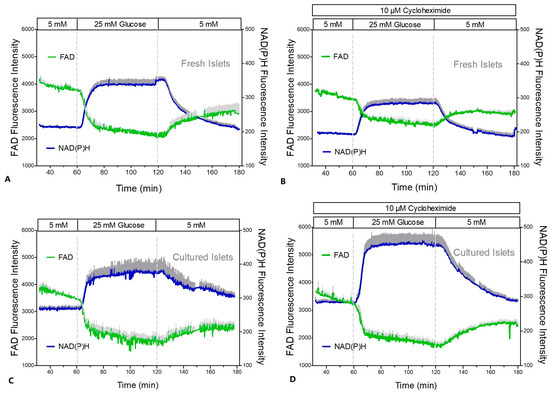NAD(P)H- and FAD-autofluorescence during glucose stimulation of fresh and cultured islets in the presence or absence of cycloheximide (CHX). Freshly isolated islets (A,B) or cultured islets (C,D) were perifused with Krebs–Ringer medium in the absence (left graphs) or presence (right graphs) of 10 μM CHX. After perifusion with 5 mM glucose for 60 min the glucose concentration was raised to 25 mM for another 60 min and was decreased back to 5 mM thereafter. The dark gray traces denote the NAD(P)H autofluorescence, and the light gray traces denote the FAD autofluorescence. In the presence of CHX they are given as dark red or light red, respectively. Values are means ± SEM of 5 experiments each.
