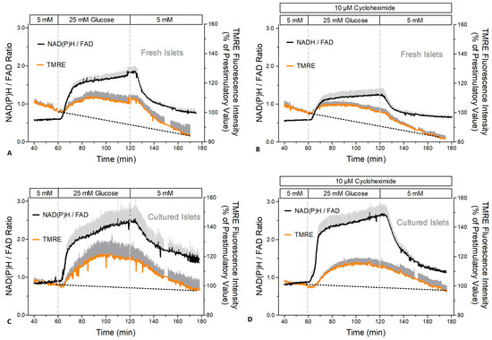 Increase in the reducing equivalents and in the mitochondrial membrane potential during glucose stimulation of fresh and cultured islets in the presence or absence of cycloheximide (CHX). Freshly isolated islets (A,B) or cultured islets (C,D) were perifused with Krebs–Ringer medium in the absence (left graphs) or presence (right graphs) of 10 μM cycloheximide (CHX, same experiments as in Figure 8). The dark gray traces denote the TMRE fluorescence as a measure of the mitochondrial membrane potentials, and the light gray traces denote the NAD(P)H/FAD ratio as a measure of the reducing equivalents. In the presence of CHX they are given as dark red or light red, respectively. Values are means ± SEM of 5 experiments each.