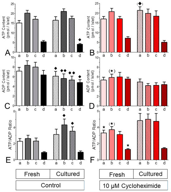 Effect of cycloheximide on the adenine nucleotide content of fresh and cultured islets. Fifteen islets each were statically incubated in parallel with the following sequence of conditions: 30 min with 5 mM glucose (a), A and an additional 20 min with 25 mM glucose (b), B and an additional 20 min with 5 mM glucose (c), C and an additional 20 min with 5 mM glucose plus 10 μM CCCP (d). For each incubation condition, the contents of ATP (A,B), ADP (C,D) and the ATP/ADP ratio (E,F) were determined. The left panels show the control values, and the right panels show the effect of 10 μM cycloheximide (CHX). Note that the significant differences in the ATP/ADP ratio are primarily caused by the decrease in the ADP contents. The presence of CHX abolished these differences. * p < 0.05, (*) p < 0.07, t-test, CHX-exposed v. control islets. ♦ p < 0.05, ♦♦ p < 0.01, paired t-test, fresh vs. cultured islets. Values are means ± SEM of 5 experiments for each condition.