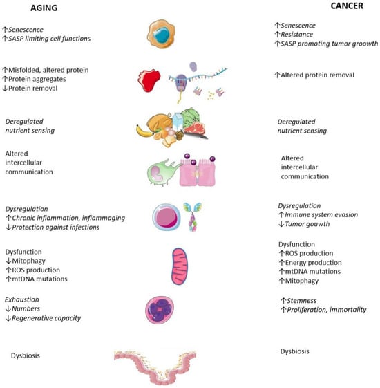 For our review, we have decided to cover the current state of knowledge in all non-genomic hallmarks of aging. To further illustrate, we explore the basic principles in which cancer, as an example of age-related diseases, intertwines with the hallmarks of aging. The review is divided into eight main chapters: senescence, disrupted proteostasis, deregulated nutrient sensing, altered intercellular communications, immune system dysfunction, mitochondrial dysfunctions and dysbiosis.
