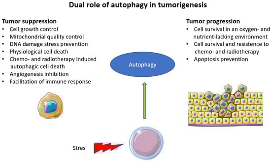 Autophagy is also closely related to cancer (Figure 3). In a similar way to aging, the activation of autophagy is often diminished. The basal level of autophagy functions as a mechanism of tumor suppression by reducing damaged cellular parts and proteins and maintaining cellular homeostasis. It also reduces invasivity and metastasis and maintains sensitivity to treatment. Disruption of autophagy, therefore, allows accumulation of pathologies in the cell and facilitates malignant transformation, cell proliferation and survival. Autophagy can be a therapeutic target [50]. However, autophagy can also drive tumorigenesis.