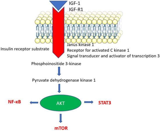 mTOR activation pathway. Legend: The IGF1 pathway: the receptor for IGF-1 (insulin growth factor 1), IGF-R1, is associated with molecules such as Janus kinase 1, insulin receptor substrate, etc.; its activation results in the activation of phosphoinositide 3-kinase, which activates pyruvate dehydrogenase kinase 1 and then AKT (protein kinase B) is activated. AKT can induce the activation of the nuclear transcription factor NF-κB and transcriptional factor STAT3 and therefore induce the production of inflammatory cytokines and mTOR (mammalian target of rapamycin).