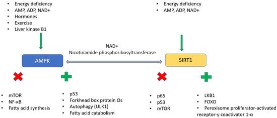 AMPK and SIRT1. Legend: AMPK (adenosine monophosphate activated protein kinase) and SIRT1 (sirtuin 1) activated by specific stimuli (green outer arrows); both can activate each other (grey double arrow). AMPK and SIRT1 support expression and activity of different proteins and genes (green plus), whereas they also inhibit other proteins and genes (red x). Abbr.: NAD, nicotinamide adenine dinucleotide; AMP, adenosine monophosphate; ADP, adenosine diphosphate; LKB1, serine-threonine kinase 11; FOXO, forkhead box O; ULK1, unc-51-like kinase 1; mTOR, mammalian target of rapamycin.