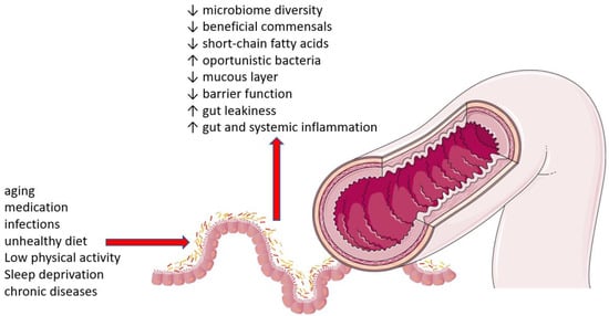 - Conway, J.; A Duggal, N. Ageing of the Gut Microbiome: Potential Influences on Immune Senescence and Inflammageing. Ageing Res. Rev. 2021, 68, 101323. [Google Scholar] [CrossRef]