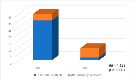 A significant association was found between AD and in-hospital mortality rate. Patients with AD had a 3.857 times higher risk of in-hospital mortality than those with AA (RR = 3.857, 95% CI: 1.127–13.196, p = 0.0006; Figure 1).