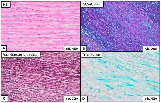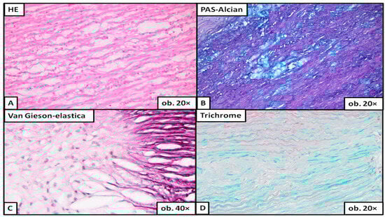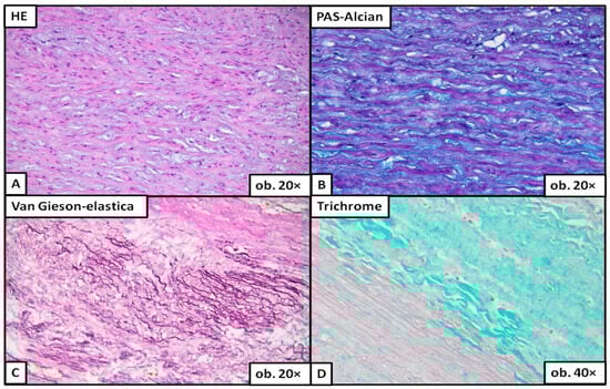 In this context, the Society for Cardiovascular Pathology and the Association for European Cardiovascular Pathology, based on studies by Halushka et al., elaborated the principles that can be used for the histological evaluation of medial degeneration. However, this classification requires time to prove its effectiveness and be unanimously accepted by the community []. In this framework, the medial degeneration and the lesions of the aortic media layer can be evaluated using hematoxylin–eosin (HE) and other histochemical stains such as trichrome, van Gieson, van Gieson–elastica, and PAS Alcian blue. These might be helpful in assessing medial fibrosis, smooth muscle cell nuclei loss or cell disorganization, laminar medial collapse, elastic fiber thinning, disorganization, fragmentation, and mucoid extracellular matrix accumulation (MEMA) with its subdivisions: interlamellar (MEMA-i) and translamellar (MEMA-t). Based on the aforementioned parameters, medial degeneration can be classified as mild, moderate, or severe [].