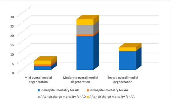 Histological samples were assessed using the standards recommended by Halushka et al. []. Using as major criteria the presence of mucoid extracellular matrix accumulation (MEMA) with either intralamellar (MEMA-i) or translamellar (MEMA-t) extension, elastic fiber changes (fragmentation and loss), smooth muscle cell changes (nuclei loss and cell disarray), and collagen alteration (laminar medial collapse), based on their severity, the overall medial degeneration was scored as mild (score 1), moderate (score 2), or severe (score 3; Table 7). The histopathological samples were analyzed considering the type of aortic disease (AD or AA) and its microscopic aspects. The differences between the two groups were examined for in-hospital and overall mortality.