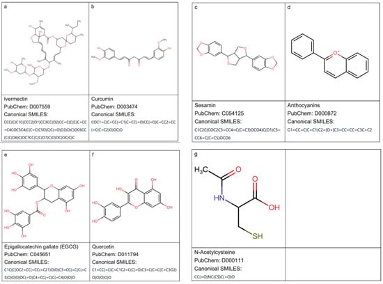 The chemical structures of (a) ivermectin and the six investigated antioxidants including (b) curcumin, (c) sesamin, (d) anthocyanins, (e) epigallocatechin gallate (EGCG), (f) quercetin, and (g) N-acetylcysteine (NAC). Chemical structures were visualized using SwissBioisostere (http://www.swissbioisostere.ch/ (accessed on 27 August 2023)) [13] from Canonical SMILES.