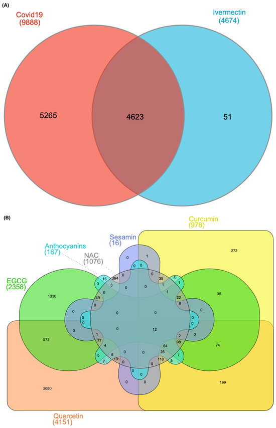 Venn diagram of the interacting genes between (A) ivermectin and COVID-19, or (B) the six investigated antioxidants and COVID-19.