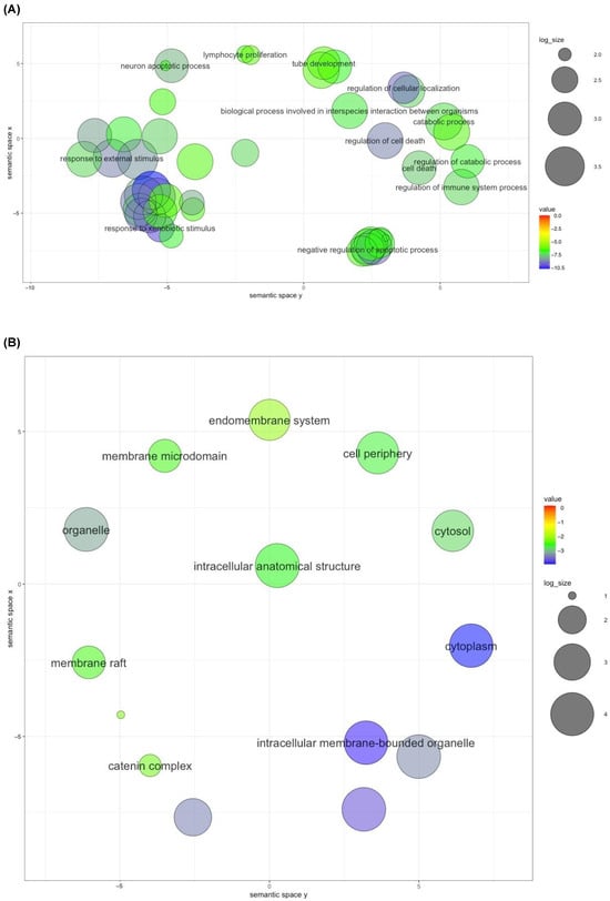For GO mapping, the GO terms for the 12 target genes based on homologies were extracted (http://www.geneontology.org (accessed on 27 August 2023)). The semantic similarities among the enriched Gene ontology (GO) terms (p value < 1%) using Gene Set Analyzer were analyzed by CTD (http://ctdbase.org/) and visualized by REVIGO (version 1.8.1; http://revigo.irb.hr/), incorporated with the R software (version 3.3.3; https://www.r-project.org/ (accessed on 27 August 2023)). Gene Ontology scatterplots were constructed by using REVIGO [60] in R for all GO terms and genes within the 12 identified target genes. Settings used for REVIGO program were as follows, database: Homo sapiens, semantic similarity: 0.7 (medium), and semantic similarity measure: SimRel.