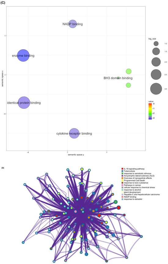 For the cellular component, it was revealed that cytoplasm (GO:0005737), intracellular membrane-bounded organelle (GO:0043231), organelle (GO:0043226), cytosol (GO:0005829), cell periphery (GO:0071944), intracellular anatomical structure (GO:0005622), membrane raft (GO:0045121), membrane microdomain (GO:0098857), catenin complex (GO:0016342), and endomembrane system (GO:0012505) related Gene Ontologies (Figure 3B; Supplementary Table S2). For molecular function, the GO terms scatterplot reveals a stronger occurrence of GO terms corresponding to enzyme binding (GO:0019899), identical protein binding (GO:0042802), cytokine receptor binding (GO:0005126), NADP binding (GO:0050661), and BH3 domain binding (GO:0051434) GO related (Figure 3C; Supplementary Table S2). In addition, the enrichment network visualization was shown with the intra- and inter-cluster similarities of the enriched terms based on the subset of representative terms from the full cluster (Figure 3D).