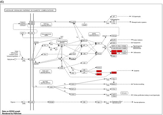 (A) KEGG pathway enrichment analysis for the target 12 genes. The gene ratios refer to the ratio of enriched genes to all target genes, and counts refer to the number of enriched genes. KEGG pathway analyses for the (B) Pertussis pathway (hsa05133) and (C) AGE-RAGE signaling pathway in diabetic complications (hsa04933).