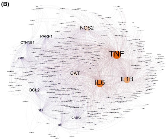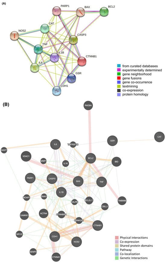 The interactions among the 12 common genes/proteins were generated by applying the online complex protein database, STRING. The PPI network was adjusted with the medium confidence interaction score of 0.4 and built with 12 nodes and 45 edges with an average node degree of 7.5 and an average clustering coefficient of 0.836. The PPI enrichment was considered significant at p-value = 5.55 × 10−9 < 0.01 (Figure 5A). In addition, we used another database to explore protein–protein interactions among the 12 common genes/proteins in the GeneMANIA website by automatically selecting weighting method with 20 related genes, 32 total genes, and 179 total links. Results showed that the interconnections between proteins were physical interaction, co-expression, shared protein domains, pathway, co-localization, and genetic interaction (Figure 5B).