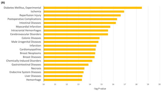 The 12 common genes/proteins from ivermectin and the 6 investigated antioxidants were fully analyzed for associated human diseases inferred by the CTD perform analyses (Figure 6A). Results showed that the top ten diseases respond to COVID-19 and ivermectin and the six investigated antioxidants were diabetes mellitus (experimental), ischemia, reperfusion injury, postoperative complications, intestinal diseases, myocardial infarction, intracranial hemorrhages, cerebrovascular disorders, colonic diseases, and male urogenital diseases (Figure 6A; Supplementary Table S4). The functional enrichment analyses for the disease–gene associations of the 12 most frequently curated ivermectin, the 6 investigated antioxidants and the COVID-19 related genes were also analyzed (Figure 6B; Supplementary Table S4). Results showed that the most curated genes were TNF, IL6, and IL1B.
