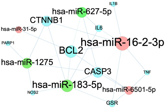 The target genes of the miRNAs are as follows: the 7 target genes (TNF, CASP3, IL1B, BCL2, IL6, GSR, and CTNNB1) of the hsa-miR-16-2-3p microRNA, the 6 target genes (CASP3, NOS2, BCL2, IL6, GSR, and CTNNB1) of the hsa-miR-183-5p, the 4 target genes (TNF, CASP3, BCL2, and GSR) of the hsa-miR-6501-5p microRNA, the 5 target genes (CASP3, IL1B, BCL2, IL6, and CTNNB1) of the hsa-miR-627-5p microRNA, the 3 target genes (BCL2, PARP1, and CTNNB1) of the hsa-miR-31-5p microRNA, and the 5 target genes (CASP3, NOS2, BCL2, PARP1, and CTNNB1) of hsa-miR-1275 microRNA were found from the 12 commonly curated genes set individually. The network was visualized using Gephi, with blue representing target genes, red representing up-regulated microRNAs, and green representing down-regulated microRNAs (Figure 7; Table 2).