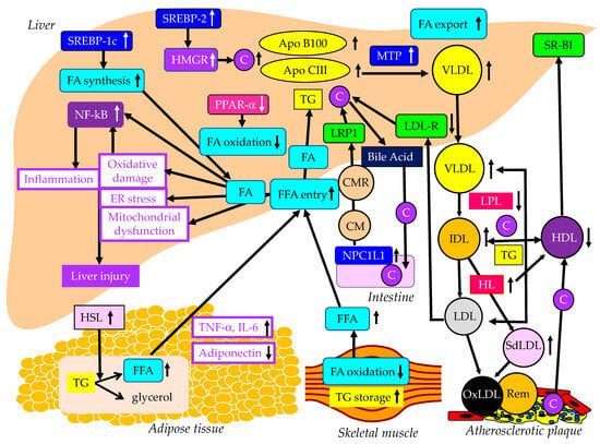 Insulin modulates LDL receptor expression and activity. The inactivity of insulin represses LDL receptor transcription [55], which can explain the increase in LDL-C in the insulin-resistant state. Niemann-Pick C1-like 1 (NPC1L1) plays a pivotal role in intestinal cholesterol absorption. The expression of NPC1L1 was investigated in non-diabetic rats and diabetic cholesterol-fed rats [56]. There was a positive correlation between intestinal NPC1L1 mRNA and chylomicron (CM) cholesterol. LDL receptor-related protein 1 (LRP1) is an endocytic and signaling receptor expressed in several tissues that plays a crucial role in clearance of CM remnants from circulation [57]. Furthermore, LDL and other cholesterol-rich, apo B-containing lipoproteins, once they become retained and modified within the arterial wall, cause atherosclerosis [58].